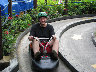 And this past Sunday we got to join him at Sentosa. The guys could not pass up riding the luge not once but twice. Three generations of dare devils. The only hat that would fit Pierce's head was pink... poor guy.